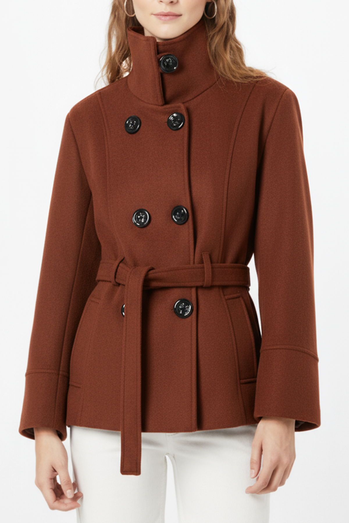 - Model ima stilsku kragnu, efektno zakopčavanje na dugmad i kaiš od iste tkanine.