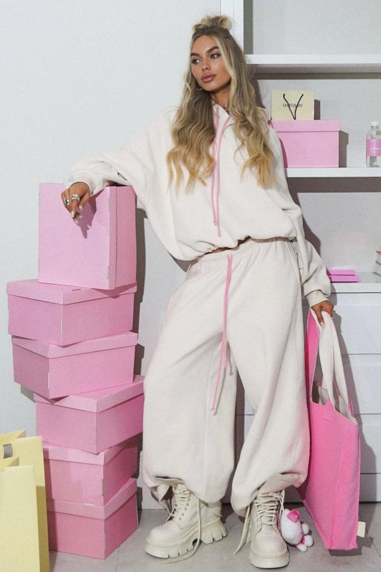 - Gornji deo je dukserica sa slobodnim klasičnim krojem, kapuljačom i ružičastim vezicama.