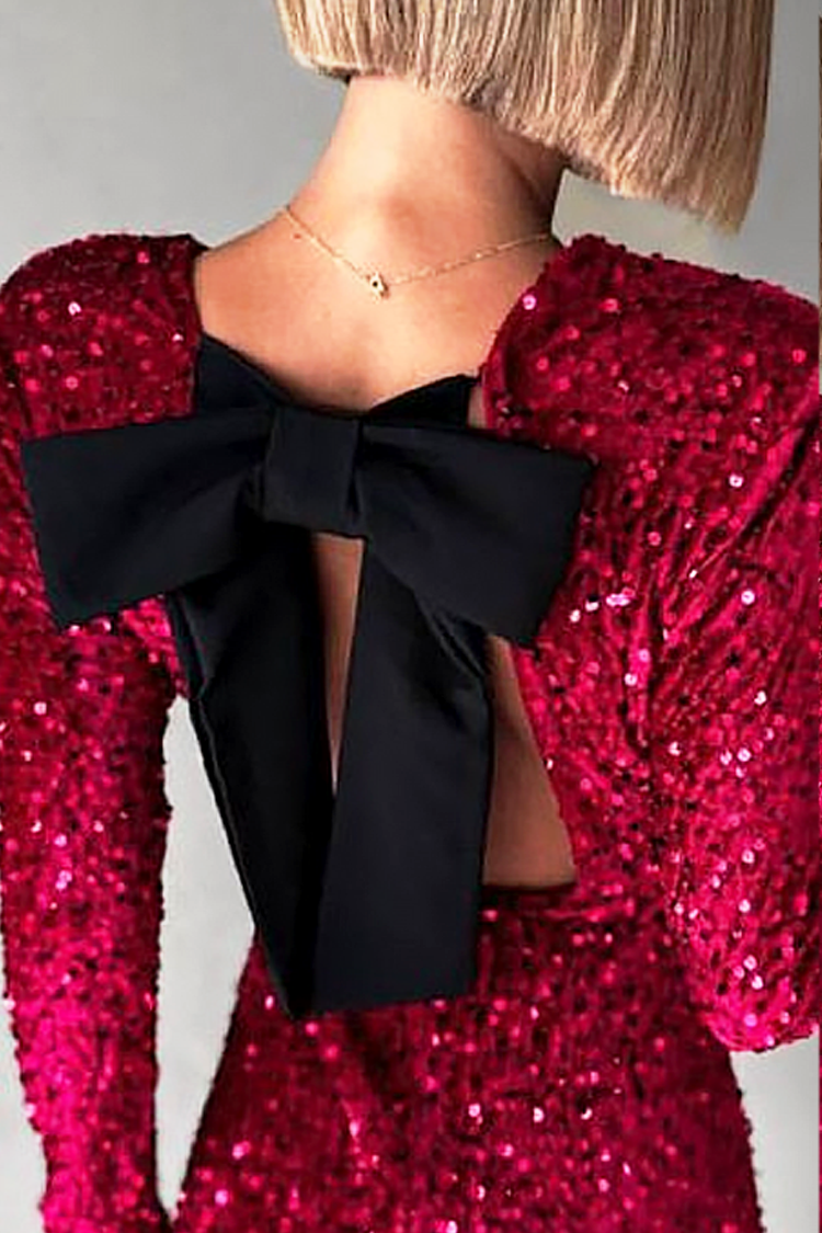 - Model ima duge rukave, sjajni efekat i izrez na leđima ukrašen trendi mašnom za impresivan izgled.