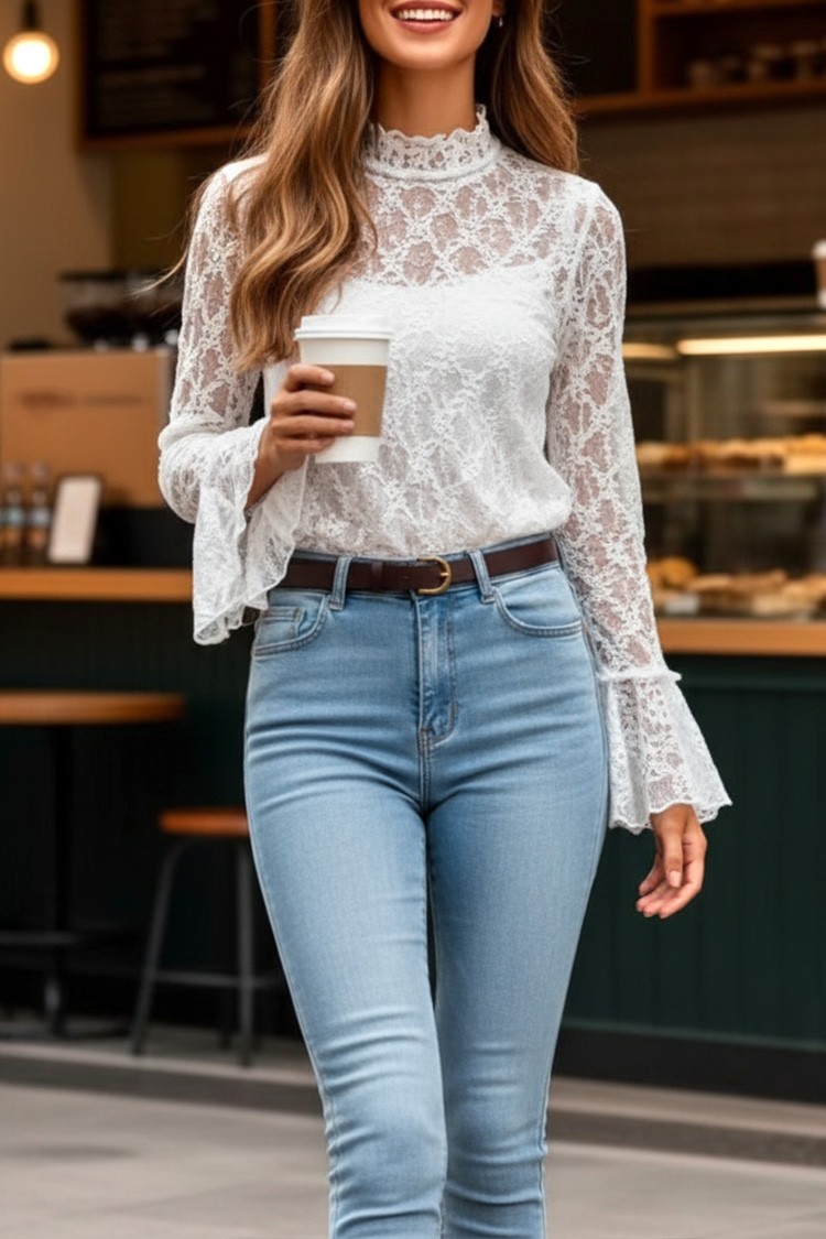 - Model ima visoku kragnu, čipku i efektne rukave.