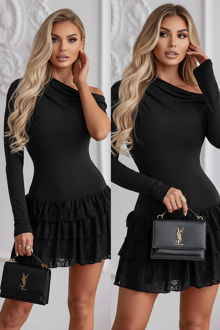 - Model ima seksi kroj uz telo i čipku na donjem delu.