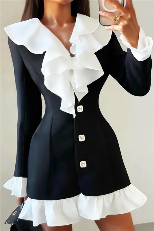 - Model ima uski i klasičan kroj, duge rukave, stilska dugmad i efektne bele volane.