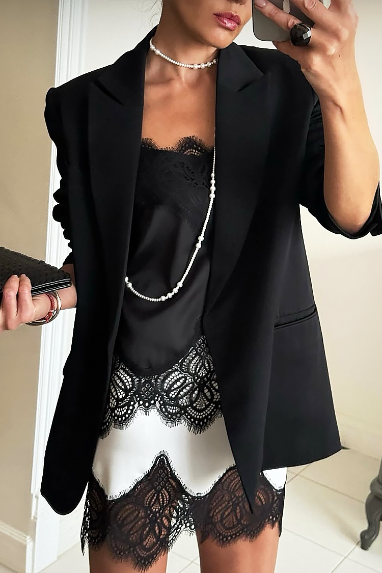 - Suknja je kratka, ima dvobojni dezen i čipku, a top ima tanke bretele i seksi dekolte.