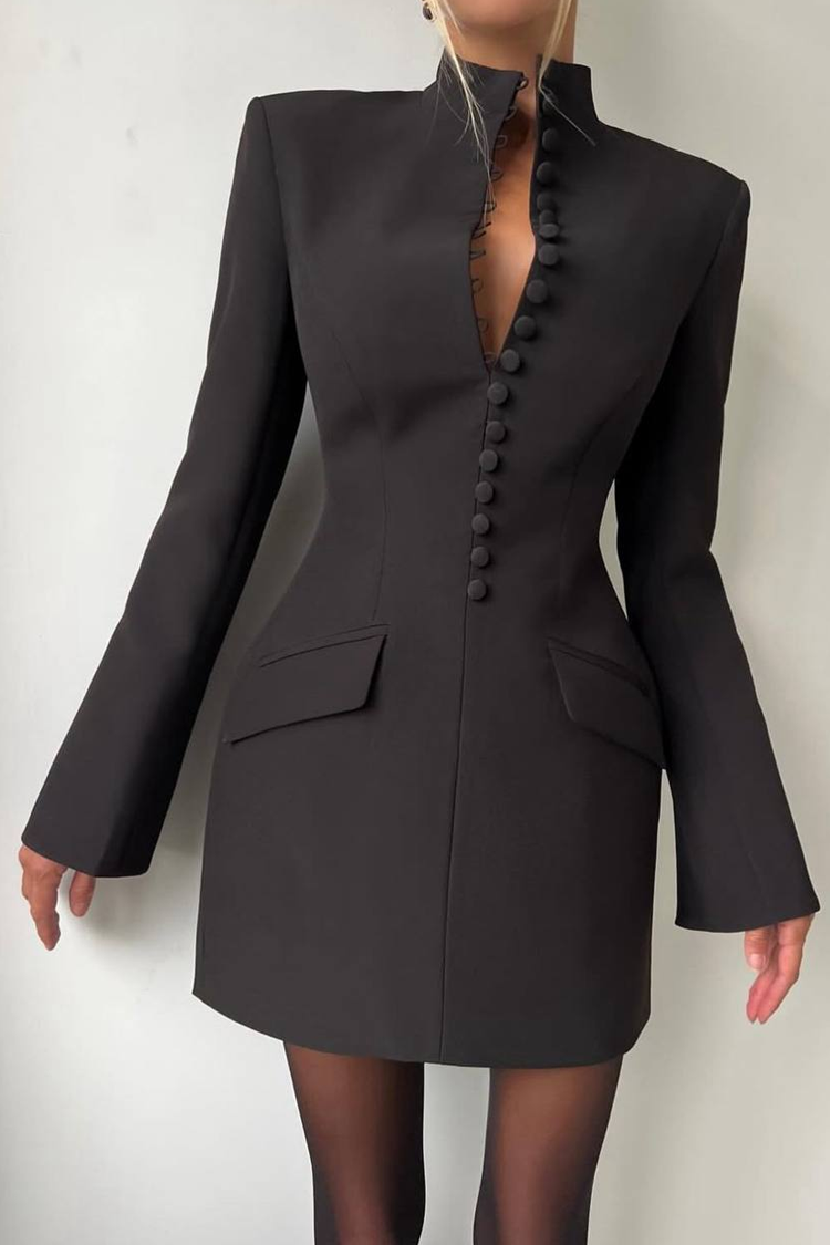 - Haljina ima elegantan kroj tipa blejzera, zakopčavanje na dugmad, duge rukave i stilske džepove.