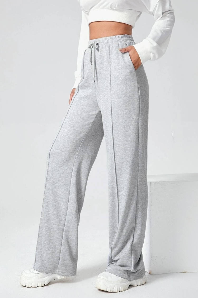 - Model ima visok, elastični struk sa vezicama, bočne džepove i široke nogavice.