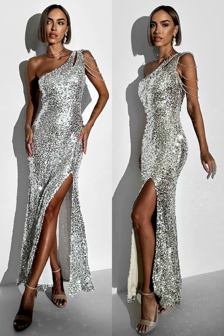 - Model ima asimetrični dekolte, efektan detalj sa lancima na jednom ramenu i visok šlic koji elegantno ističe siluetu.