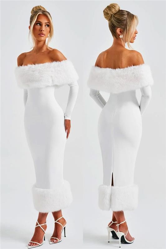- Model ima seksi kroj uz telo, spuštena ramena, dubok šlic na leđima i mekane pahuljaste detalje za akcenat.