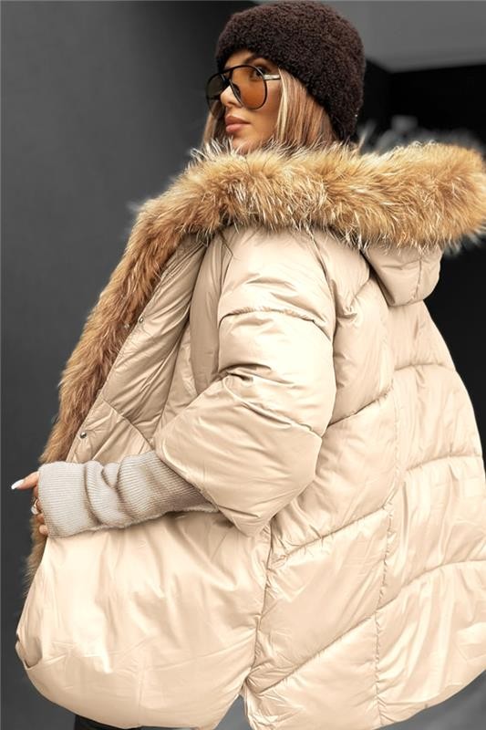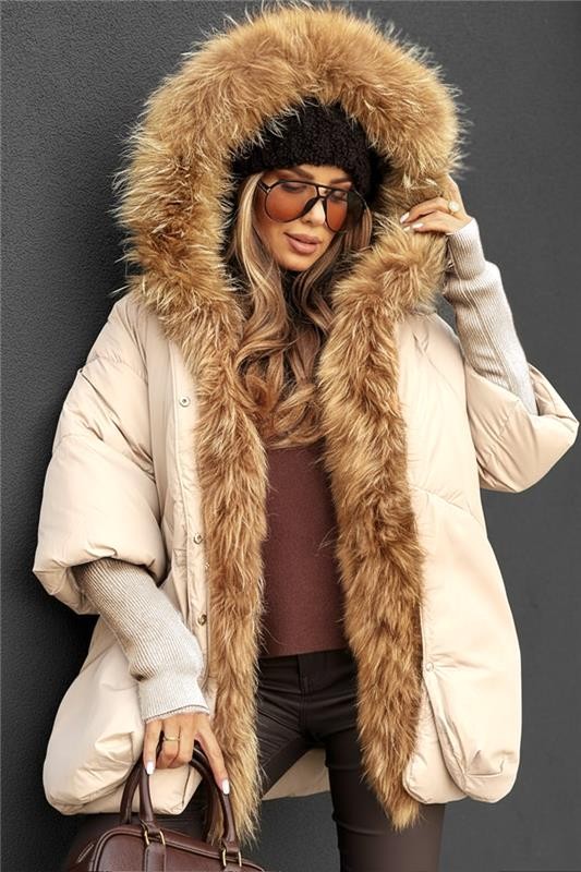 - Model ima udoban kroj, zakopčavanje na dugmad, voluminoznu kapuljaču i paperje po celoj dužini.