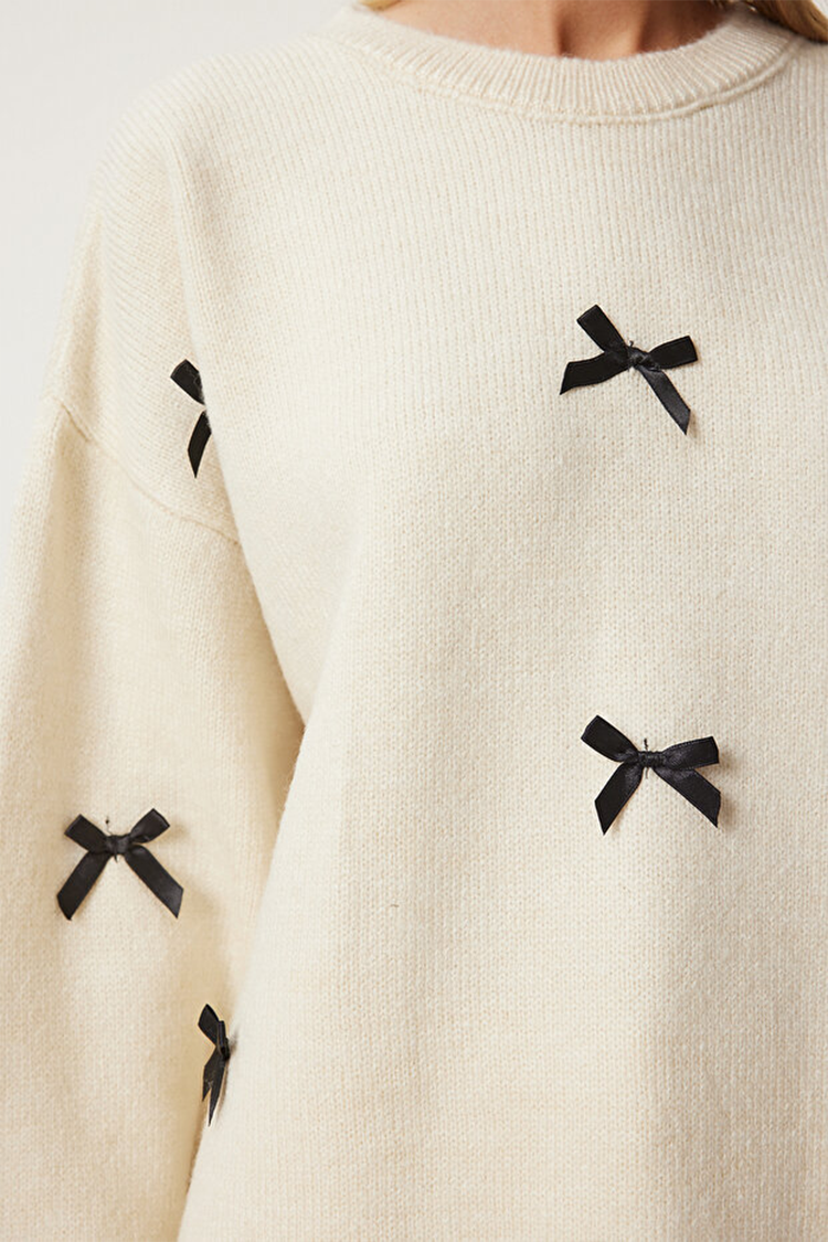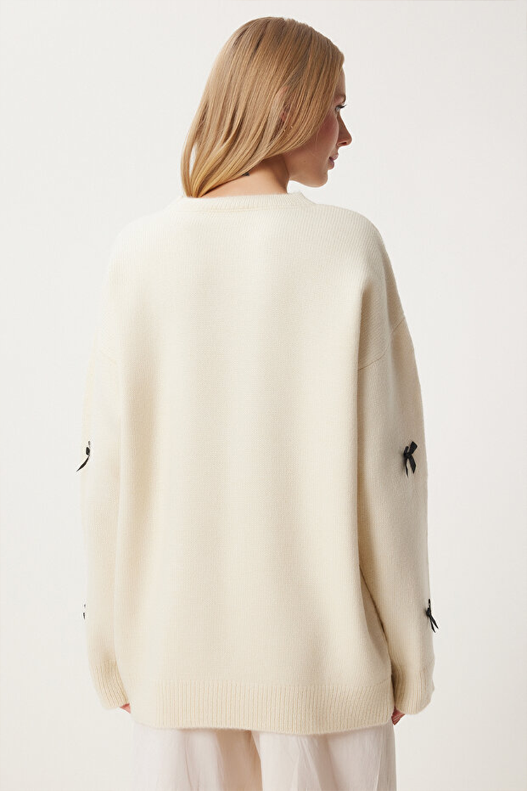 - Model ima klasičan oversize kroj, okrugli dekolte i mašne po celoj dužini.