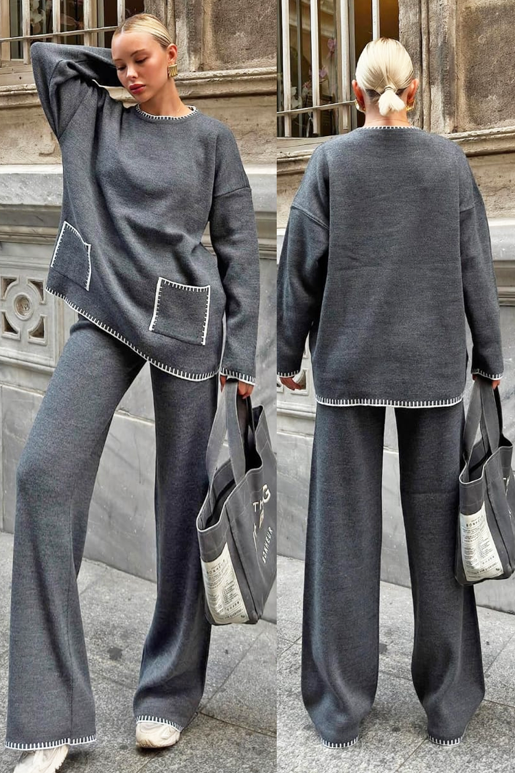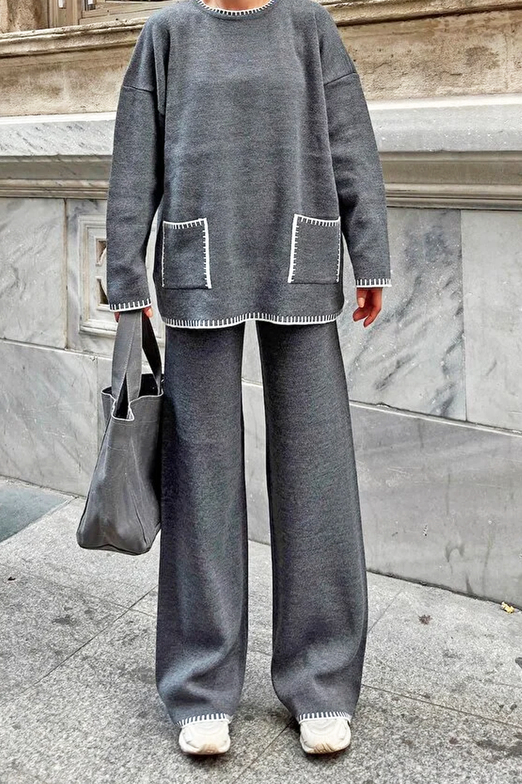 • Džemper ima klasičan kroj i džepove, a pantalone visok struk i širok kroj.