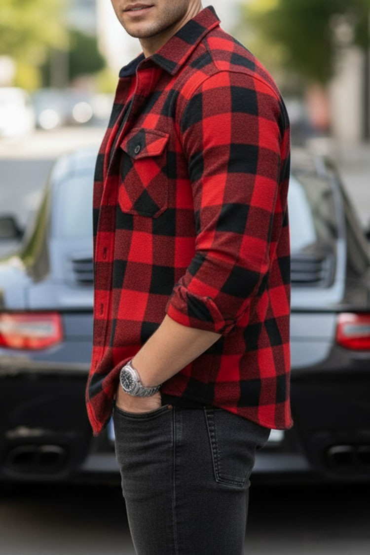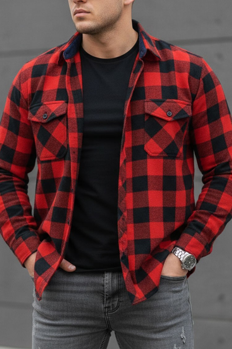 - Moderna muška košulja sa kariranim dezenom u trendi boji sa kragnom i velikim džepovima sa preklopom.