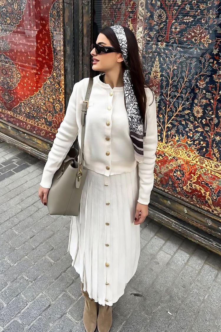 - Model nosi midi suknju sa efektnim dugmadima po celoj dužini i vestu klasičnog kroja.