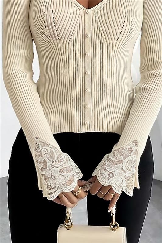 - Bluza ima duge rukave, ukrasnau dugmad, uski kroj i elegantan čipkasti akcenat.