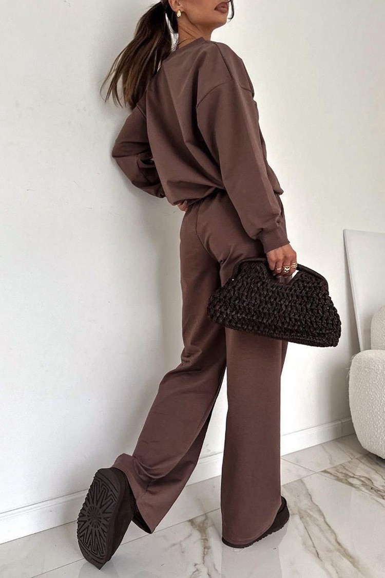 - Bluza ima slobodan kroj i okrugli dekolte, a pantalone visok struk i široke nogavice sa lastišom na kraju.
