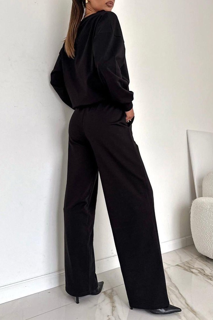 - Bluza ima slobodan kroj i okrugli dekolte, a pantalone visok struk i široke nogavice sa lastišom na kraju.