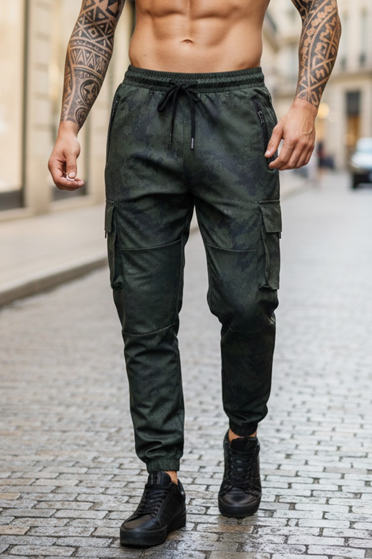- Muške kargo pantalone u trendi boji sa kamuflažnim dezenom, pogodne za svakodnevno nošenje.