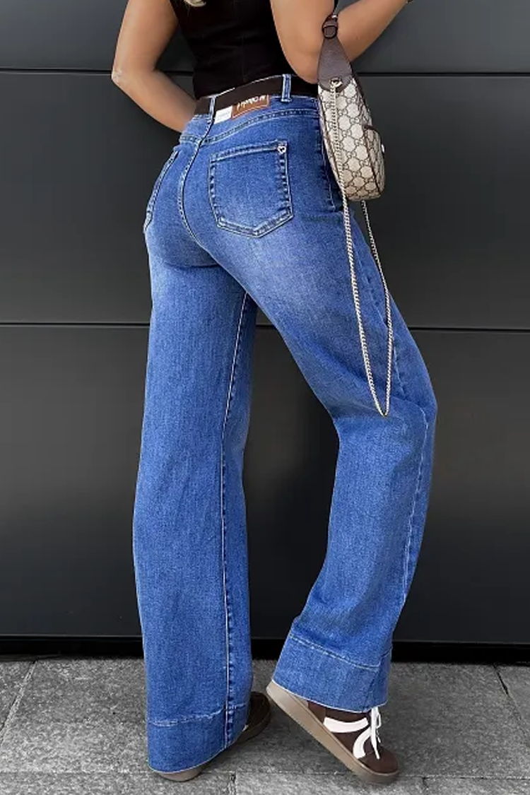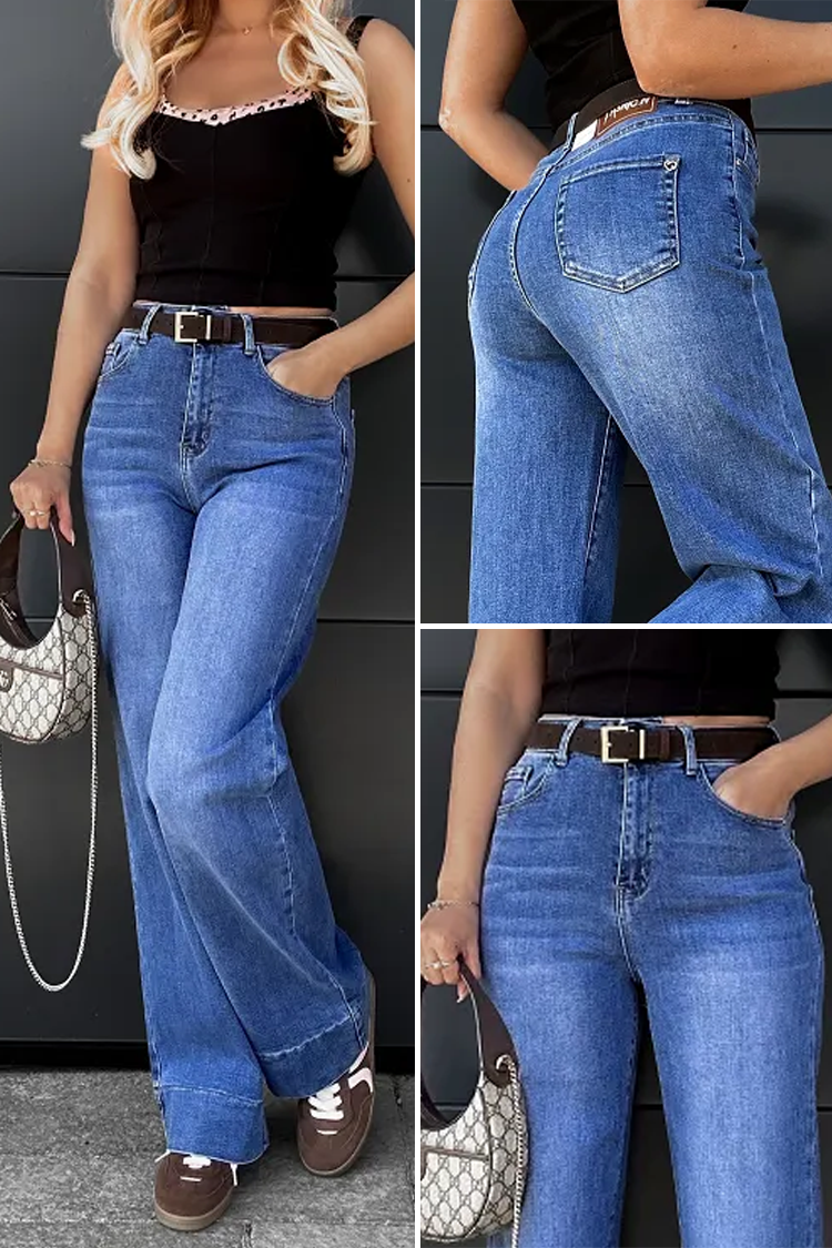 - Model ima visok struk, široke nogavice i moderan dizajn.