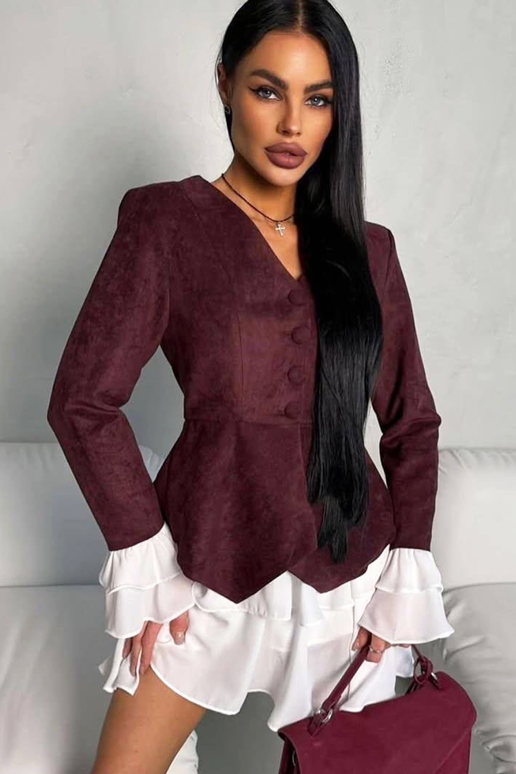 - Sako ima okrugli dekolte i trendi rukave. Zakopčava se dugmadima napred.