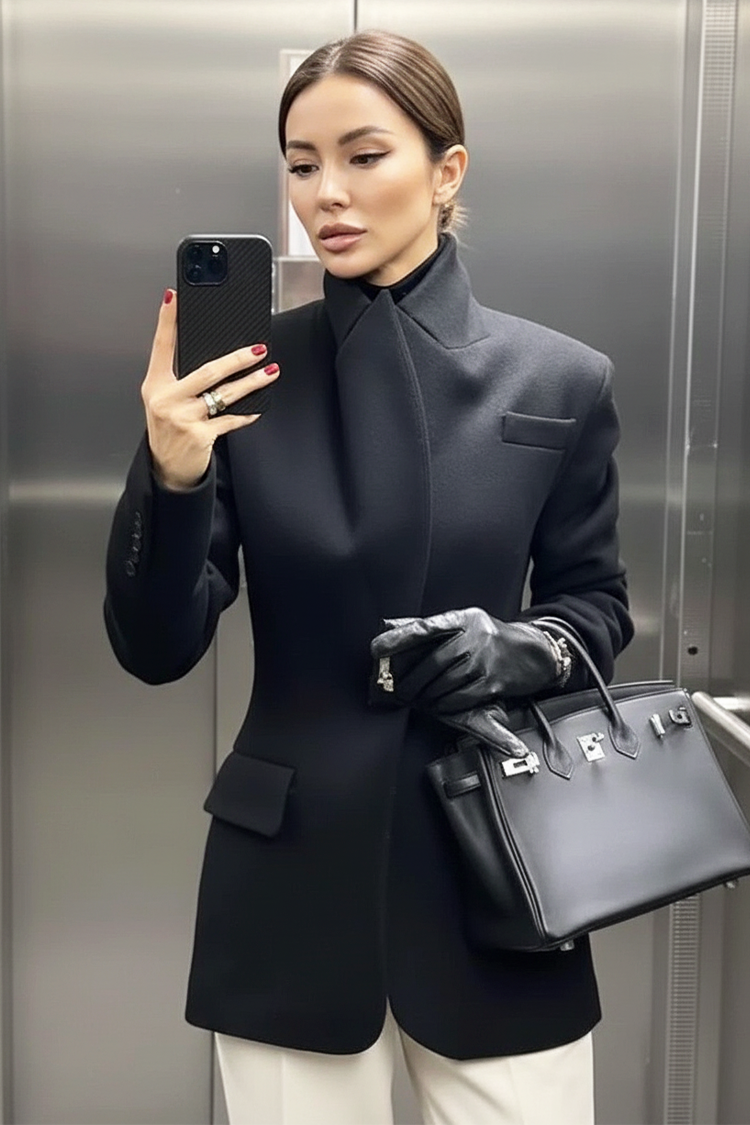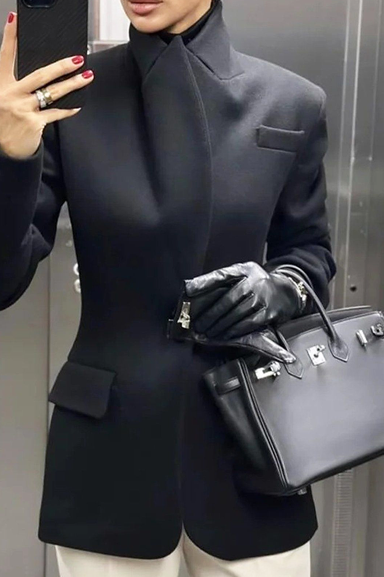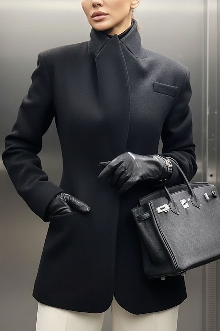 - Model ima elegantan, uski kroj, upotpunjen dekorativnim džepovima i skrivenim unutrašnjim kopčanjem na dugmad.