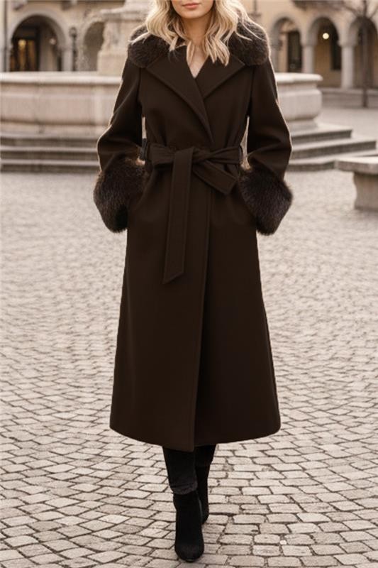 - Model ima klasičan dizajn, kaiš od iste tkanine i voluminoznu kragnu sa manžetnama.
