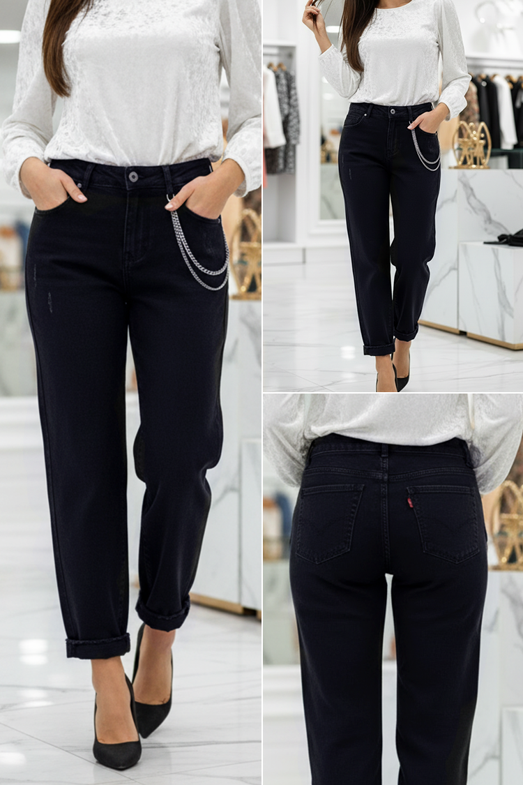 - Model ima visok struk, udoban kroj, džepove i ukrasni lanac za stilski akcenat.