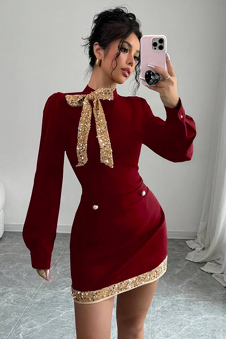 - Model ima ukrasnu mašnu sa šljokicama i pufnaste rukave.