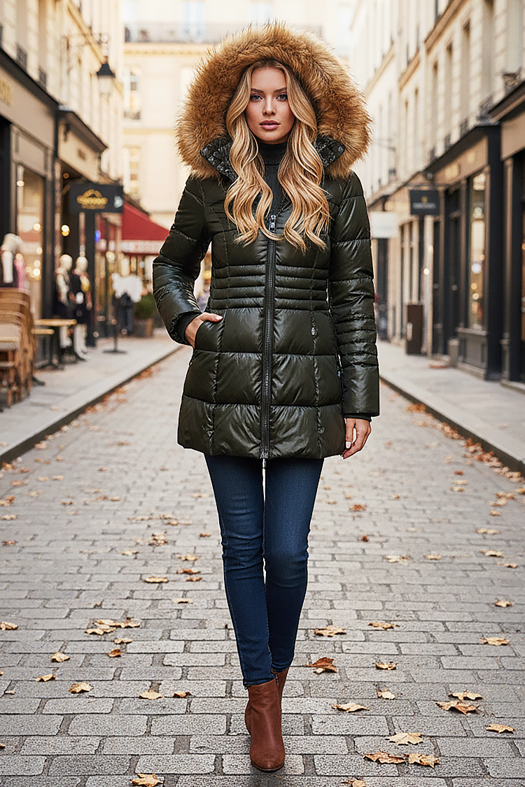 • Model ima kapuljaču sa perjem i praktične džepove i prošiveni dizajn.