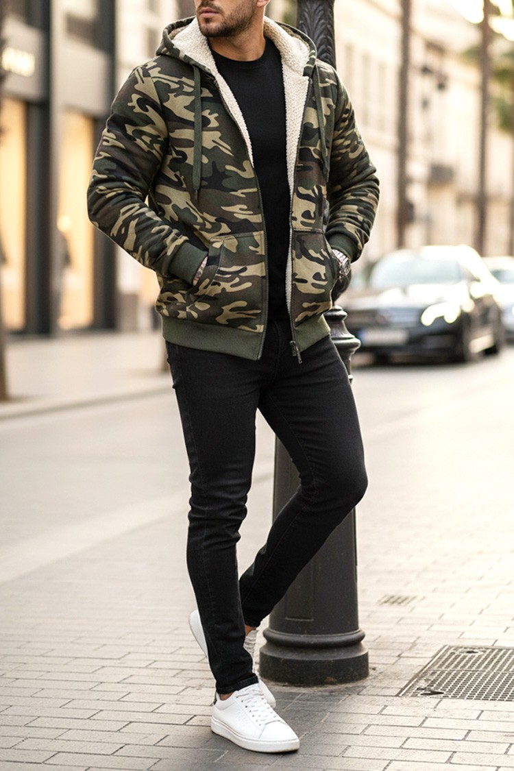 - Praktična i udobna muška dukserica sa kamuflažnim dezenom i mekanom postavom, pogodna za svakodnevno nošenje.