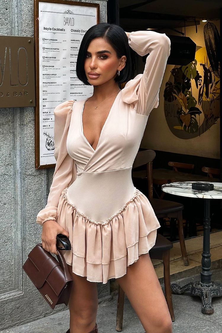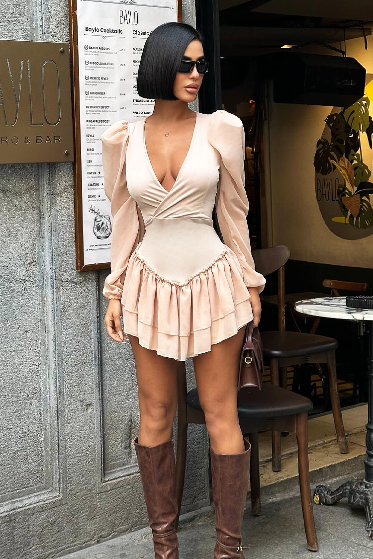 - Model ima dubok dekolte i pufnaste rukave od blago providne tkanine.