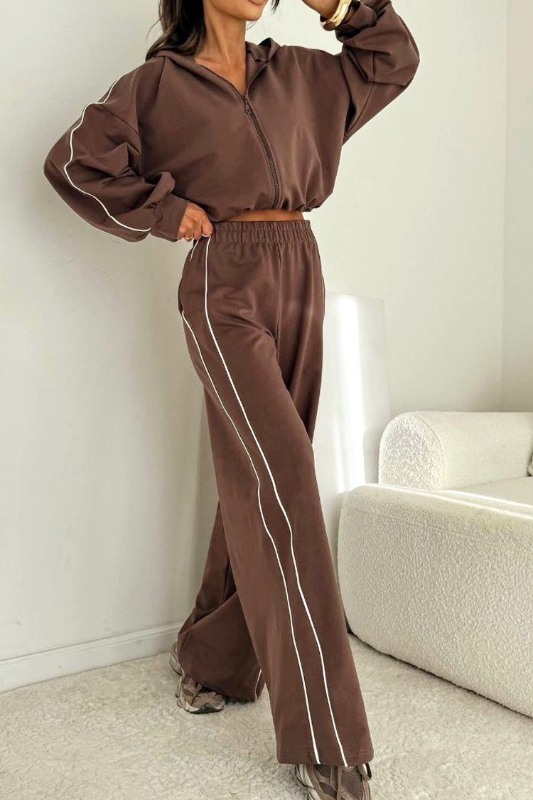- Dukserica ima rajsferšlus i kapuljaču, a pantalone visok struk i široke nogavice.