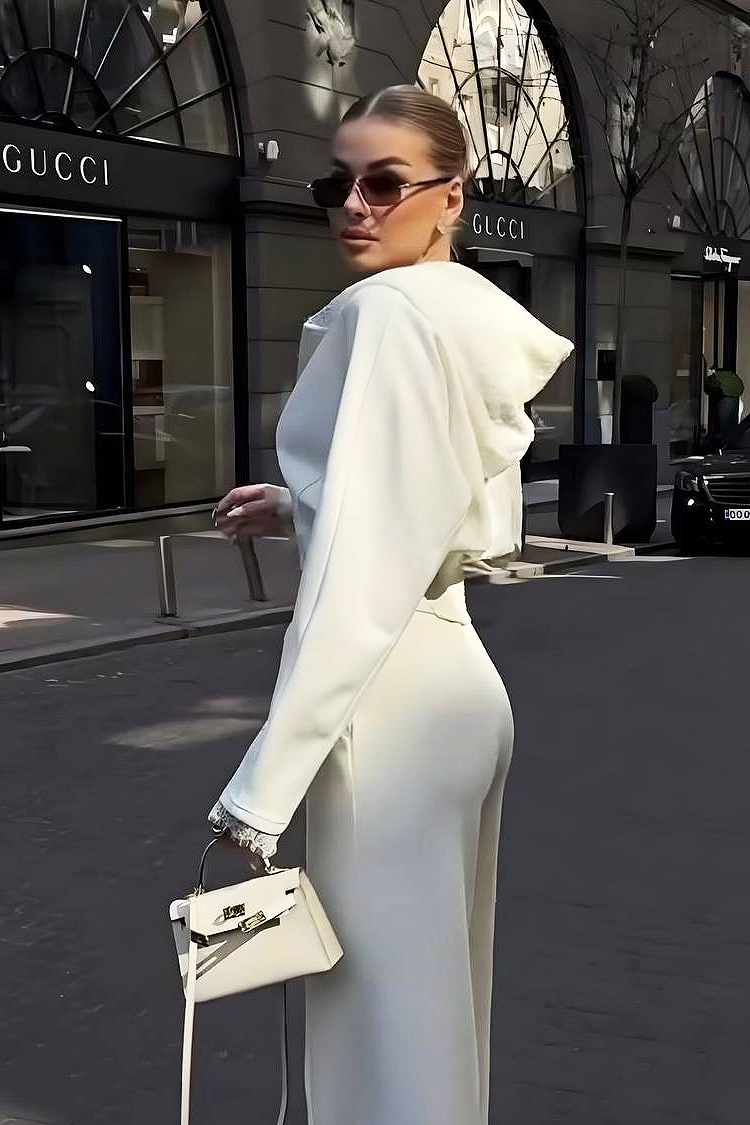 • Dukserica ima rajsferšlus i efektnu kapuljaču, a pantalone imaju visok struk sa vezicama i široke nogavice.
