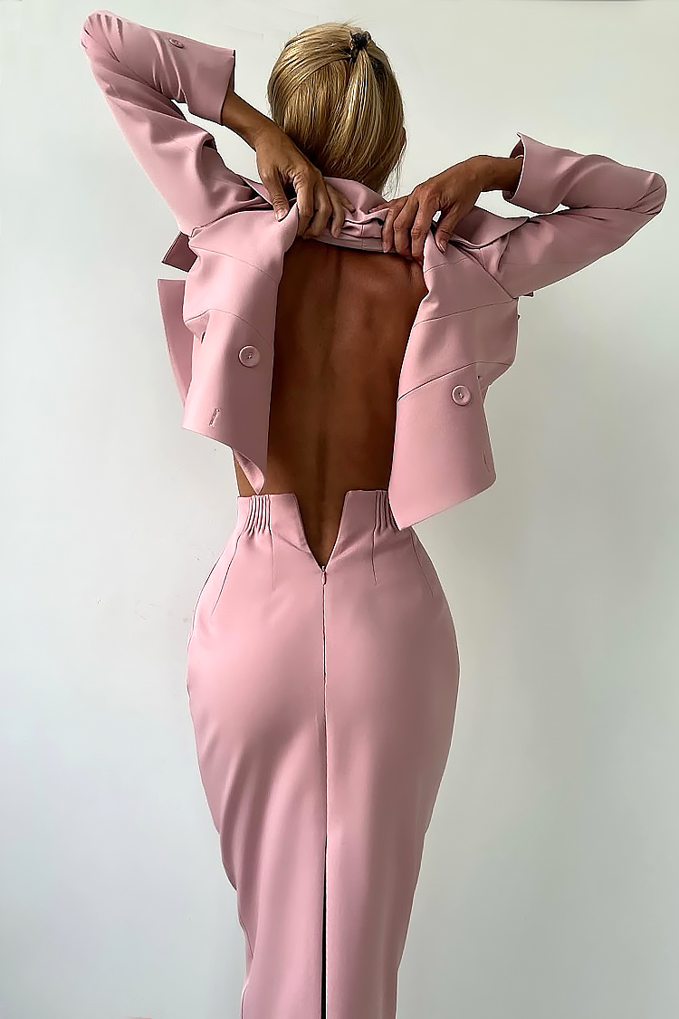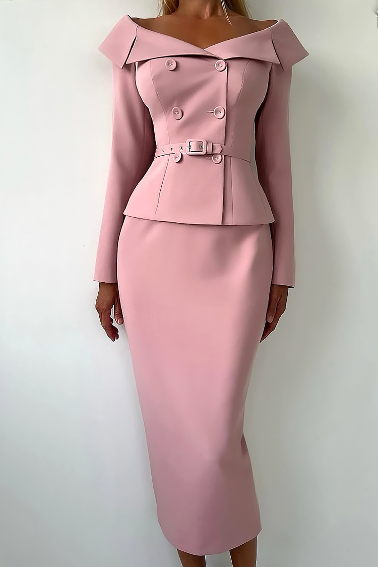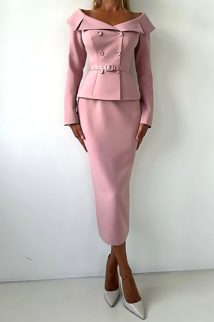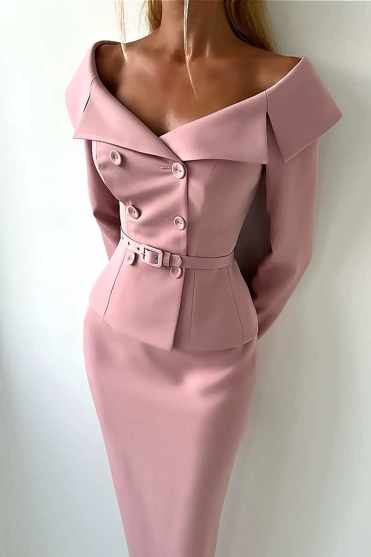 - Sako ima elegantan kroj, dugmad, stilski kaiš i efektnu kragnu sa otvorenim ramenima, a suknja je midi dužine i klasičnog kroja.