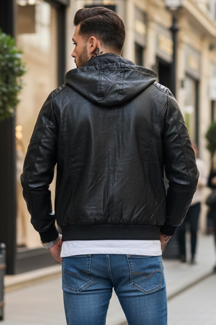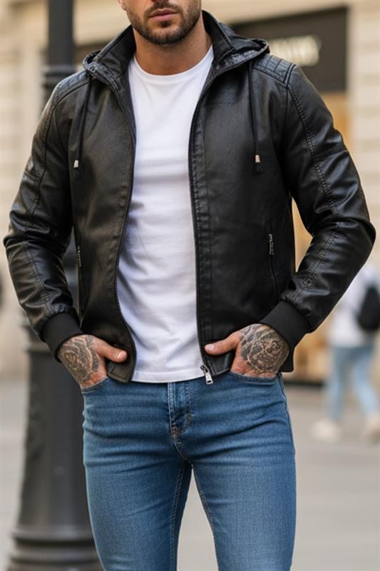 • Muška jakna sa jastučićima za ramena i kapuljačom sa vezicama u crnoj boji, pogodna za svakodnevno nošenje.