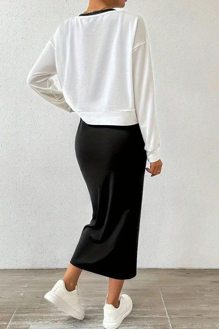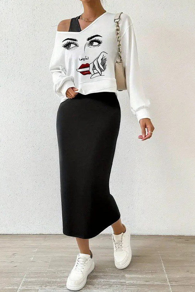 • Haljina je u klasičnoj crnoj boji, a bluza ima efektno spušteno rame i print.