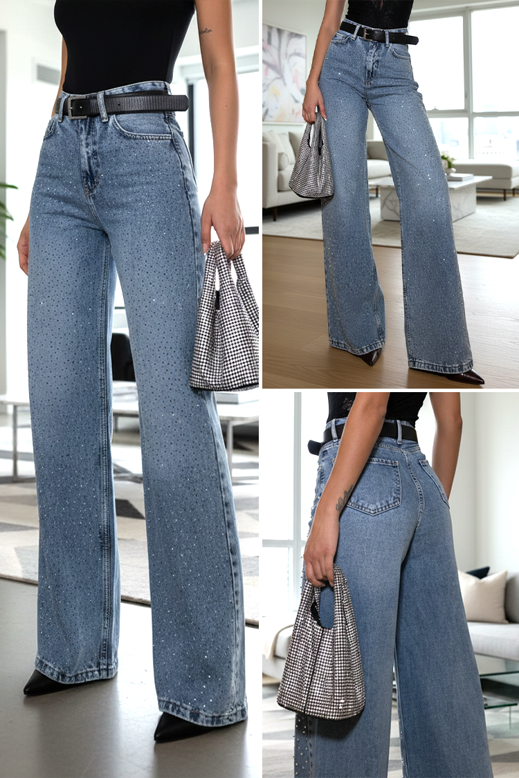 - Model ima visok struk, široke nogavice i sjajne, dekorativne elemente.