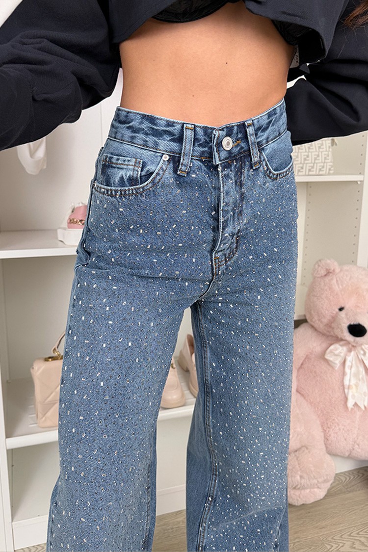 • Model ima visok struk, široke nogavice i sjajne, dekorativne elemente.