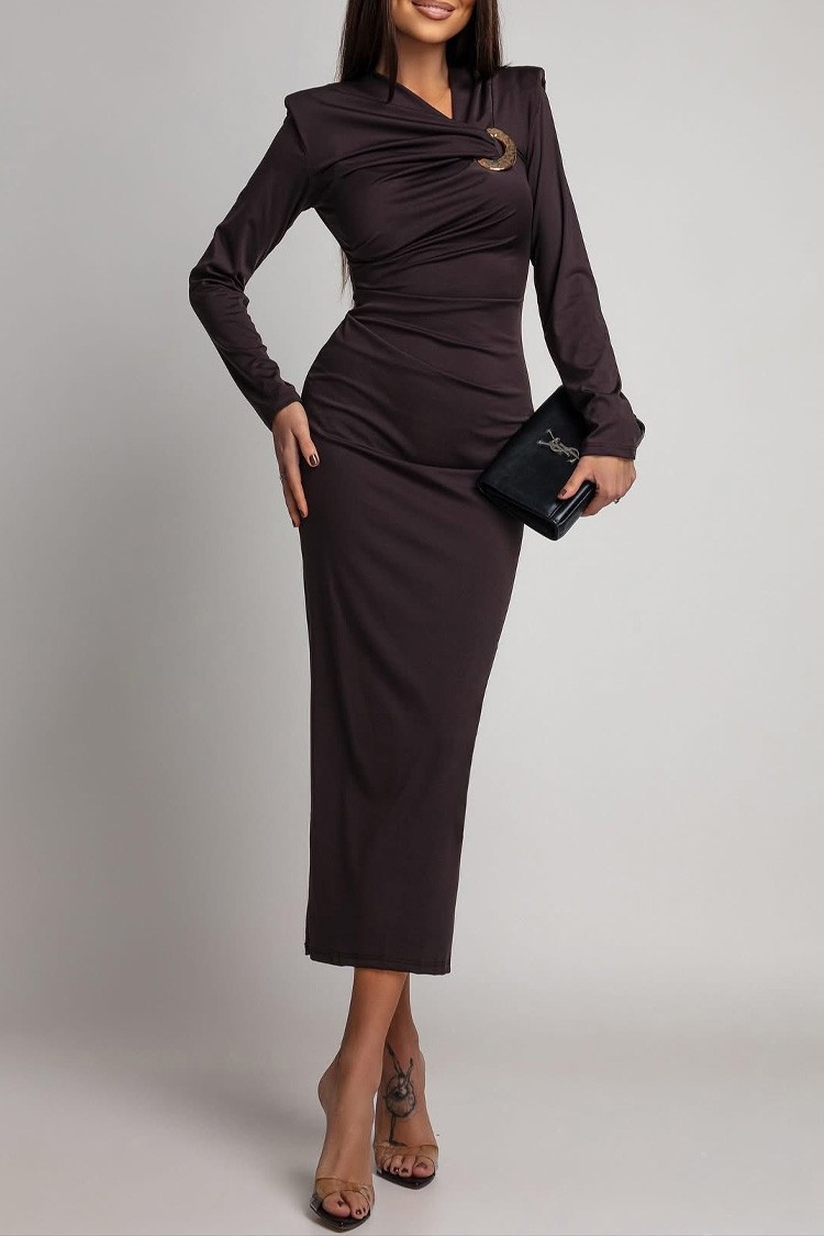 - Model ima efektan dekolte sa metalnim detaljima, duge rukave i šlic na leđima.