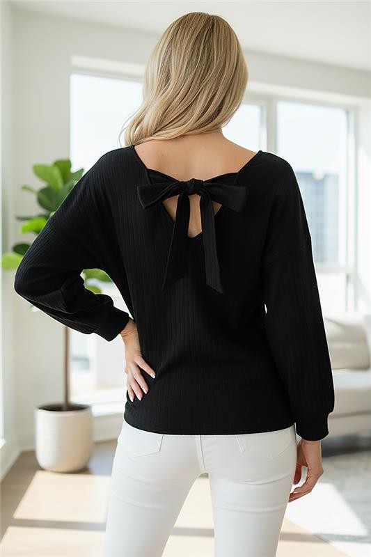 - Model ima V-izrezan dekolte i ukrasnu mašnu na leđima.
