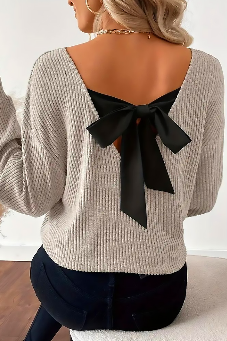 - Model ima V-izrezan dekolte i ukrasnu mašnu na leđima.