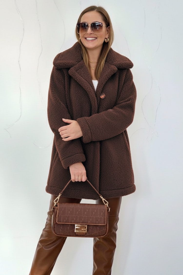 - Model ima klasičan dizajn, praktične džepove, voluminoznu kragnu i dugmad na prednjoj strani.