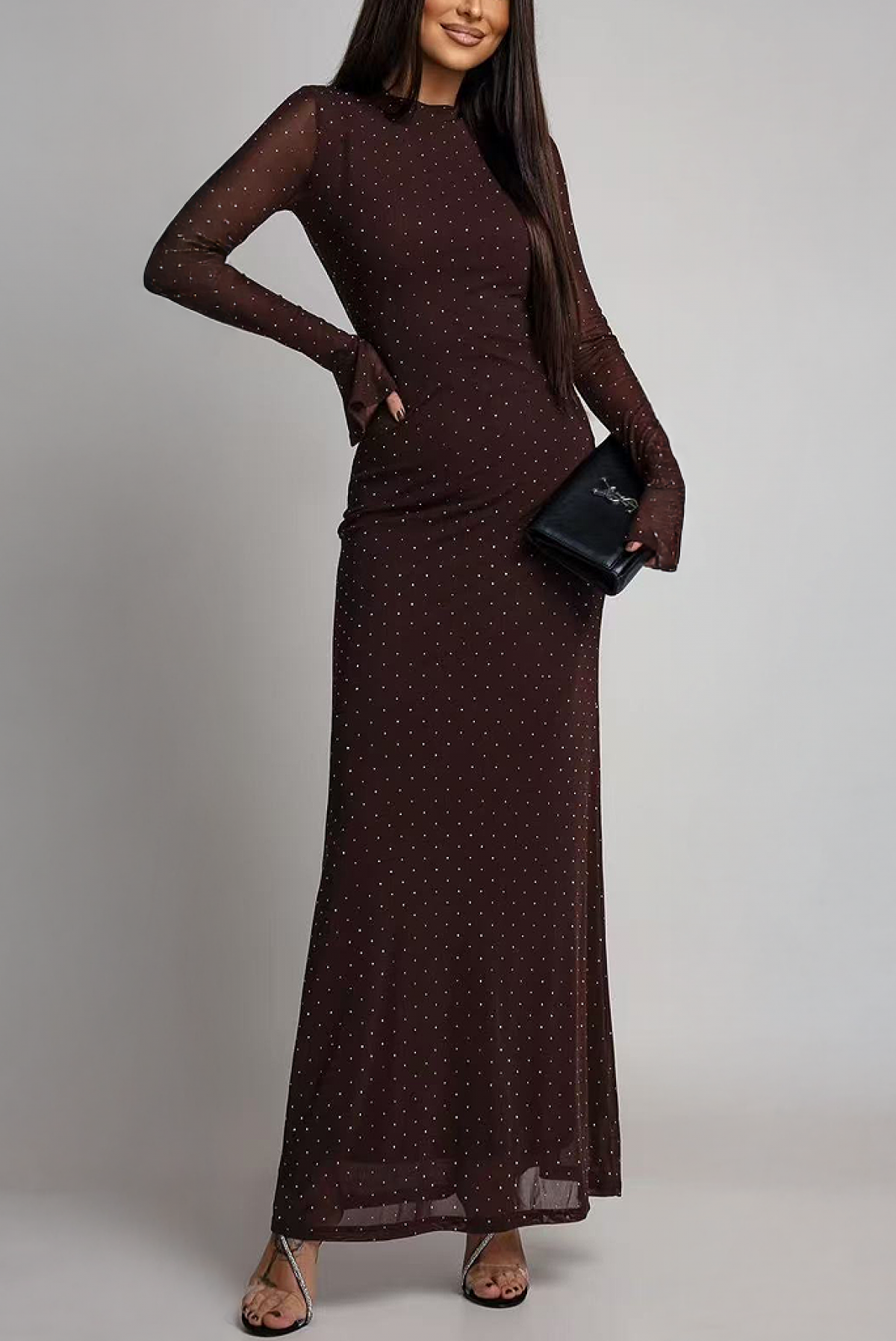 - Model ima uski kroj, duge rukave, sjajne detalje i gola leđa.