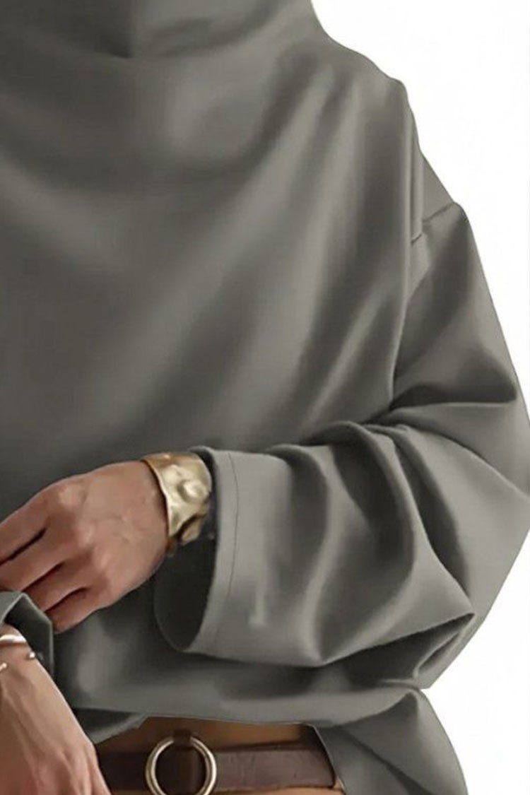 - Bluza ima duge rukave, elegantan oversize kroj i stilsku polo kragnu.
