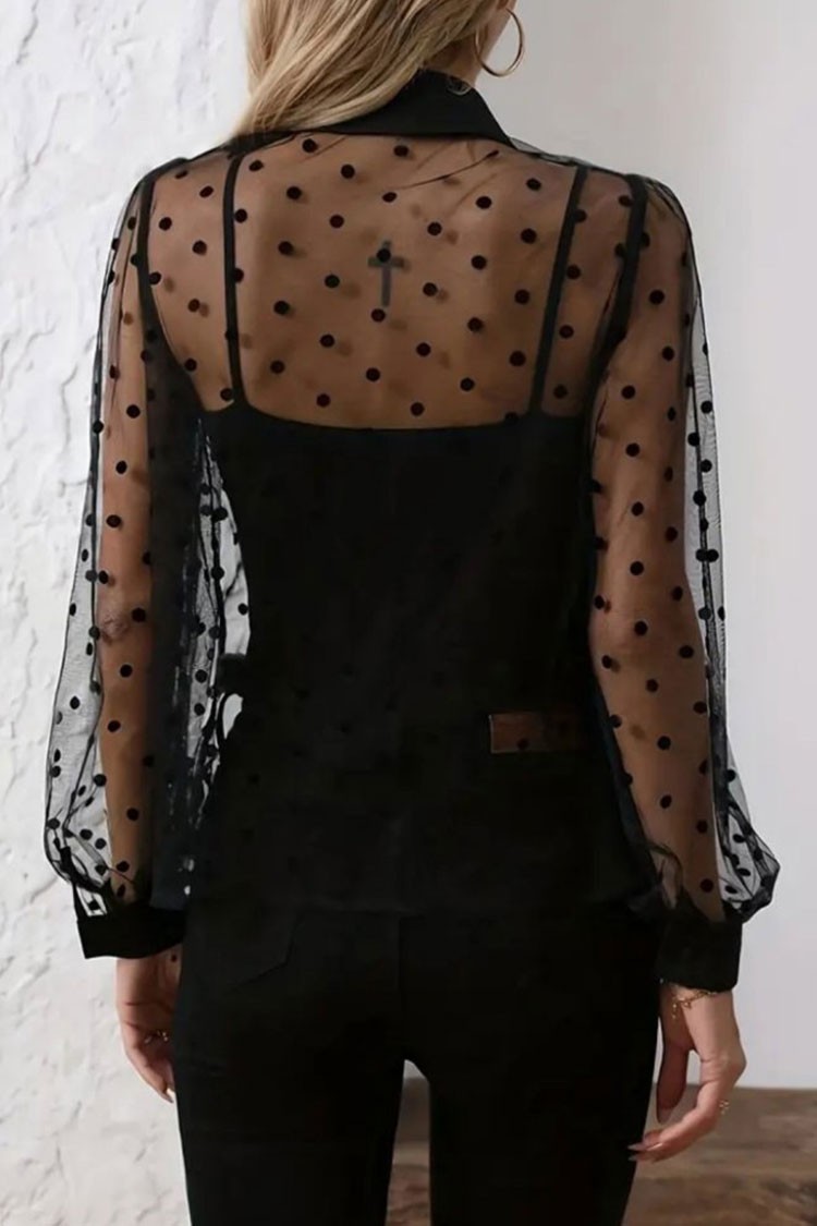 - Košulja ima duge rukave, standardno zakopčavanje na dugmad i providnu tkaninu, a gornji deo je jednostavnog dizajna i crne boje.