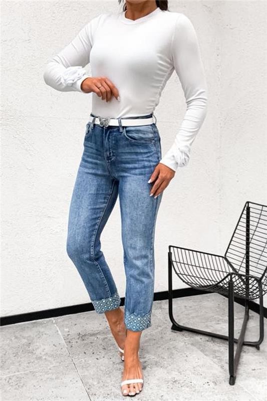 - Model ima visok struk i precizan kroj i trendi nogavice sa sjajnim elementima.
