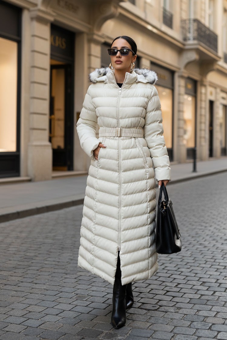 - Model ima slobodan kroj, praktične džepove i efektan kaiš i kapuljaču sa paperjem.