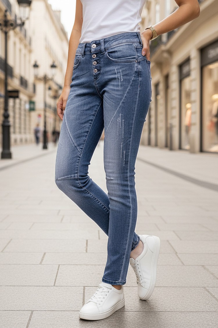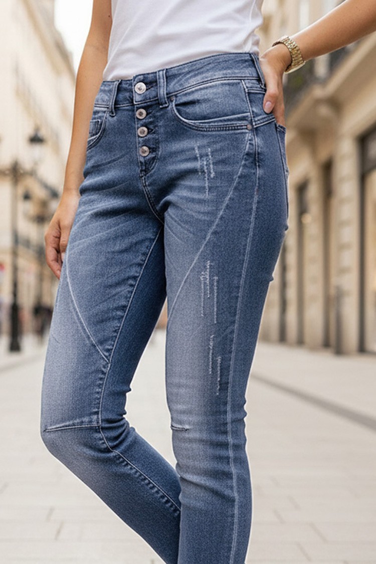 • Osvežite svoj garderober plavim farmerkama sa izbeljenim efektom i dekorativnim šavovima, pogodnim za svakodnevni život.