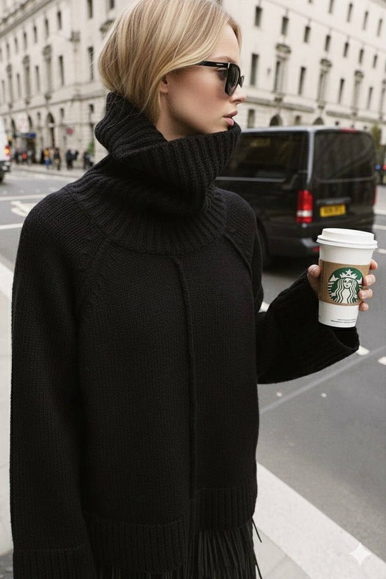 - Model ima duge rukave, preveliki kroj, efektne duge rukave i polo kragnu.