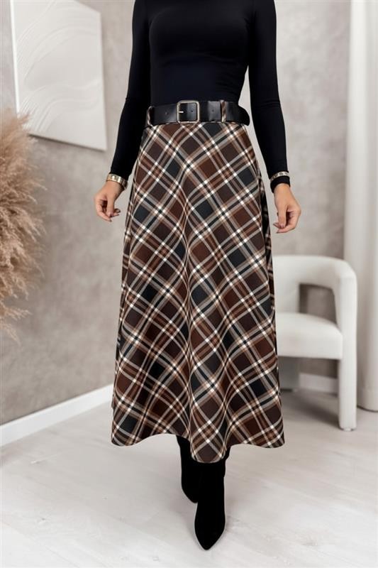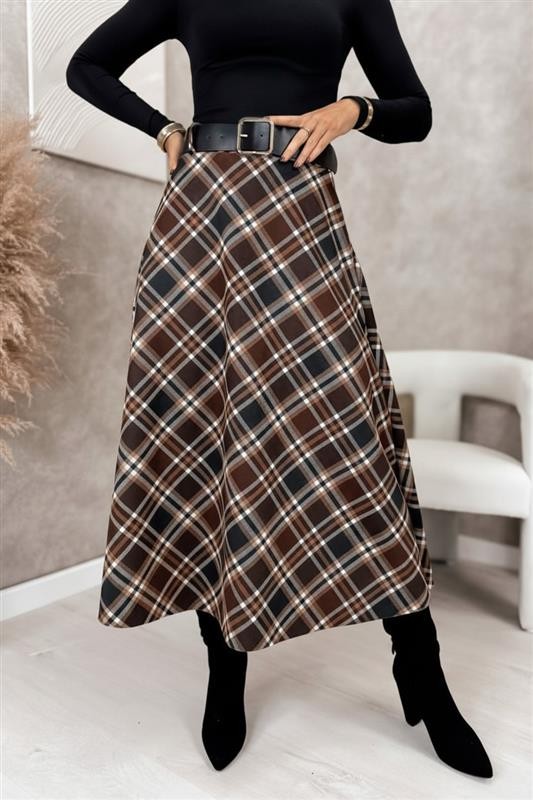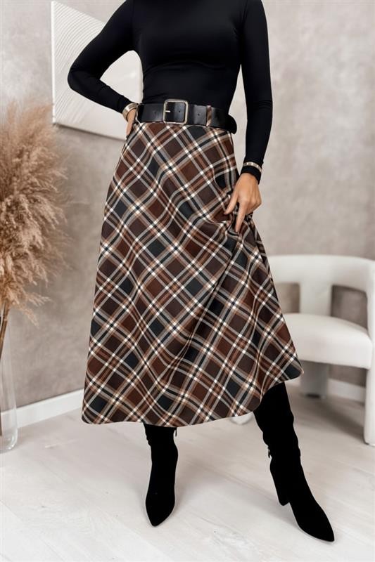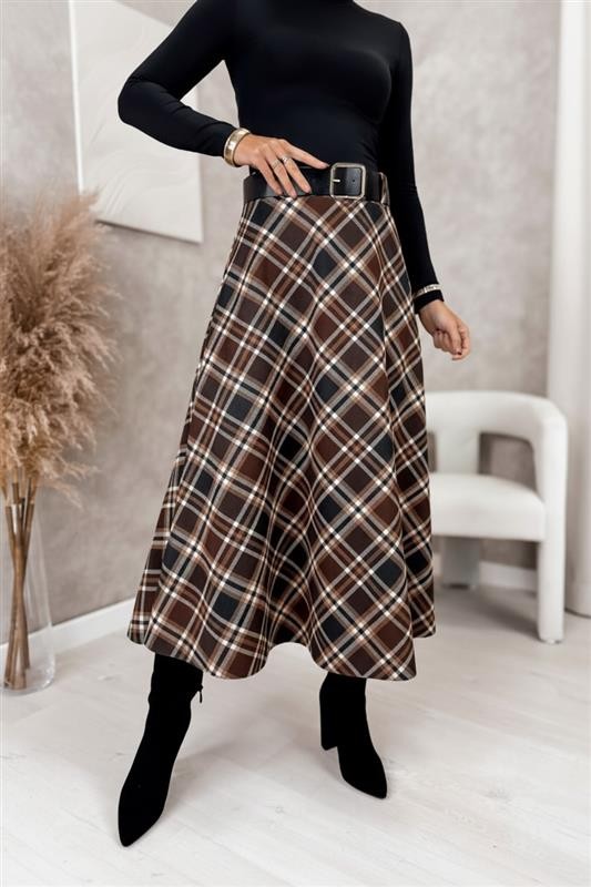 - Model ima visok struk, kaiš od eko kože i efektan, karirani dizajn.