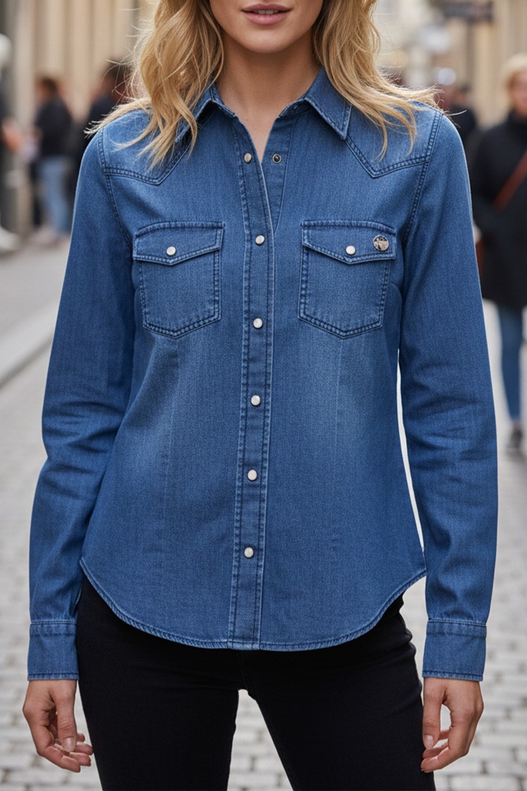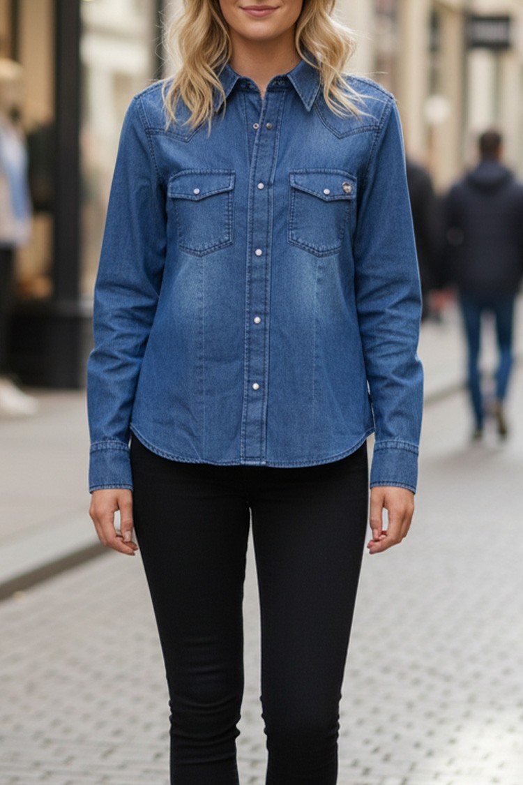 - Praktična ženska košulja čistog dizajna, sa preklopnim džepovima i tik tak kopčom, pogodna za razne modne kombinacije.