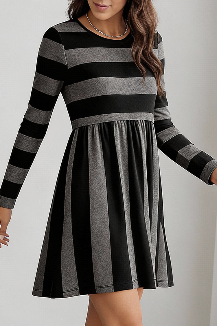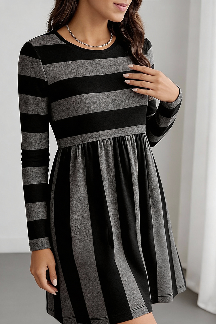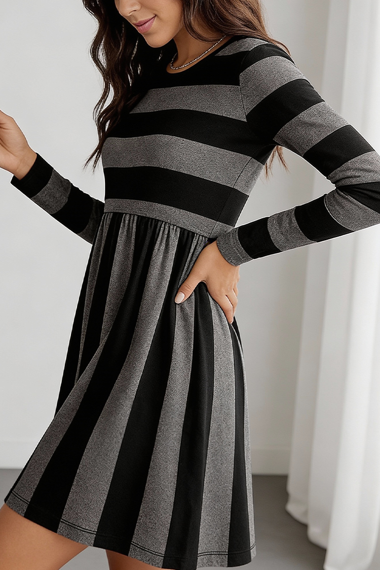 • Za vaš svakodnevni izgled, izaberite ovu kratku haljinu sa prugastim dezenom.